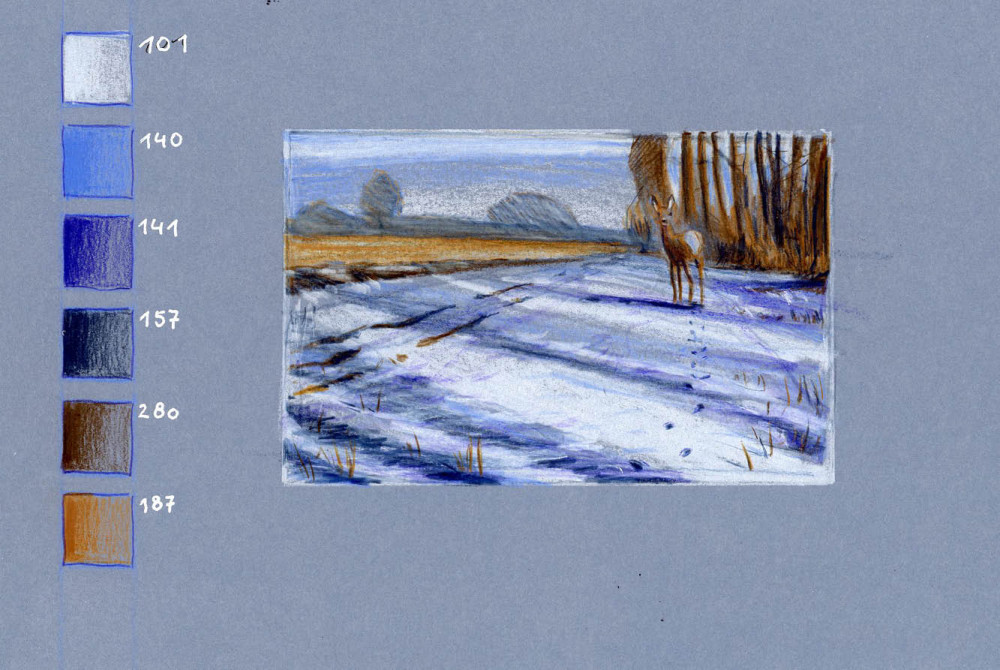 Kadmiumgelb mittel, Lichter Ocker, Zinnoberrot, Siena gebrannt, Umbra gebrannt, Ultra Marin Blau, Paynesgrau bläulich, Coelinblauton, Alizarin- Karmesin, Saftgrün, Lasurorange