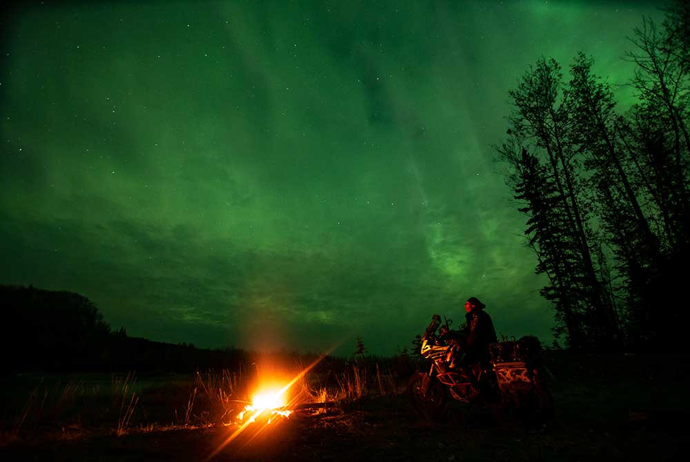 Unfall und Pannen fast an seine existenziellen Grenzen. Über tausende unebene Kilometer führt die Reise dennoch spektakulär weiter bis zur arktischen Küste und nach Alaska. Dort in der Heimat von Grizzlybären und Wölfen, entlang des Polarkreises mit seinen langen Tagen und bunten