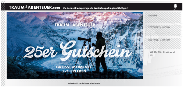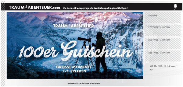 Die TRAUM & ABENTEUER-Gutscheine sind für jede TRAUM & ABENTEUER-Veranstaltung (außer bei Kooperationen mit dem Theaterhaus) gültig und können hier online erworben und eingelöst werden. Sollte der Wert des Gutscheins vom Kaufwert abweichen, wird der Differenzbetrag gutgeschrieben.